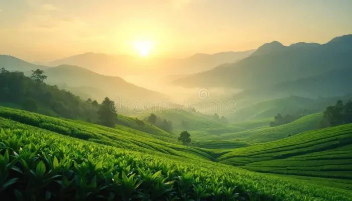 Saat mereka sampai di puncak bukit kecil, pemandangan terbuka lebar. Hamparan teh hijau bergelombang seperti lautan zamrud, kabut masih menari-nari di lembah bawah, dan sinar matahari pagi menyelinap membentuk sinar-sinar keemasan (crepuscular rays).